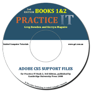 The Adobe CS5 Support Files are aimed at students in years 7 to 10 and can be used separately from the Practice IT text books, but the books do provide projects at the end of each software module and theory modules on computer awareness and the social impacts of computer use.